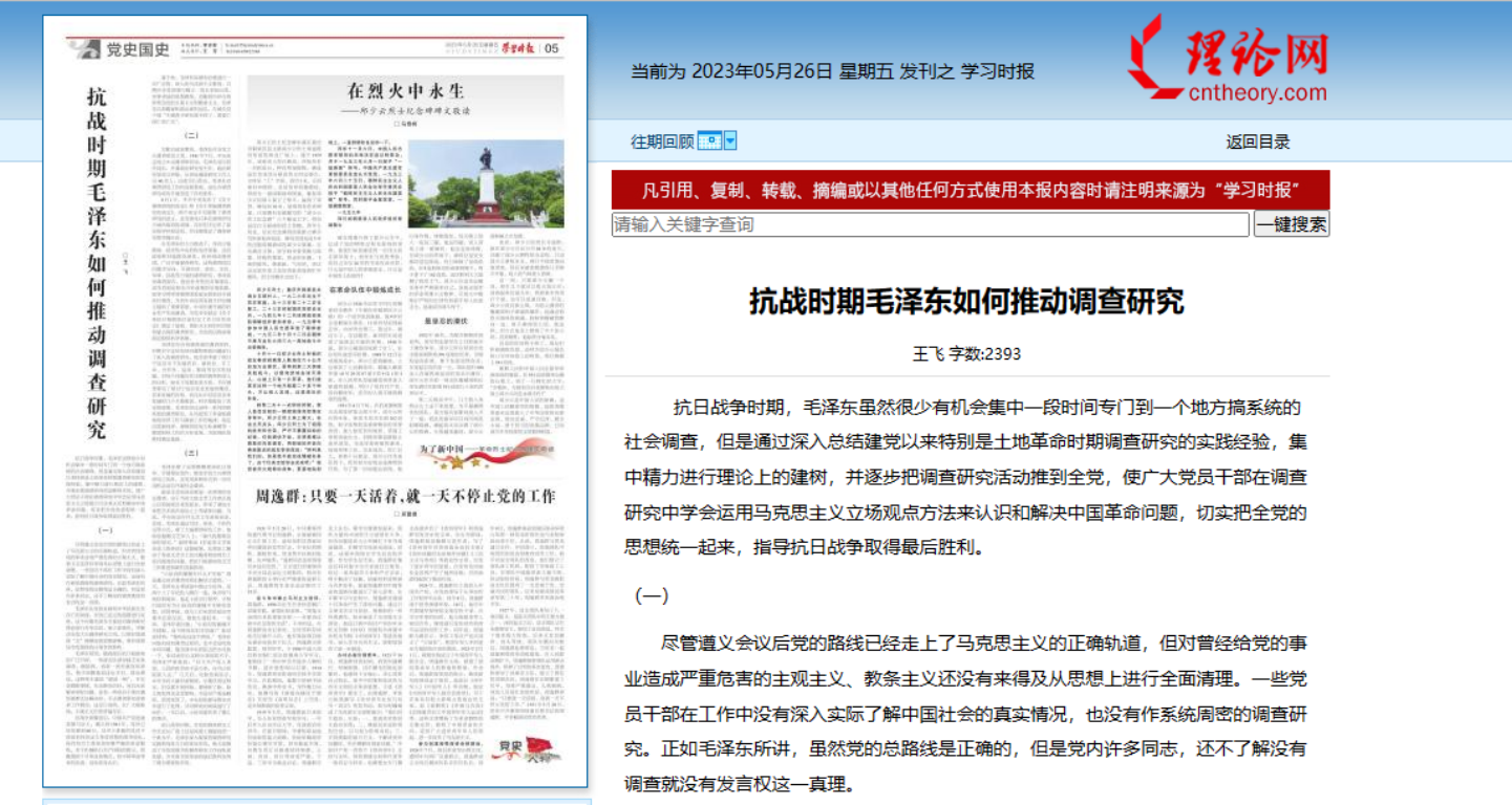 《学习时报》2023年5月26日第5版“党史国史”刊发我院王飞教授的理论文章《抗战时期毛泽东如何推动调查研究》。